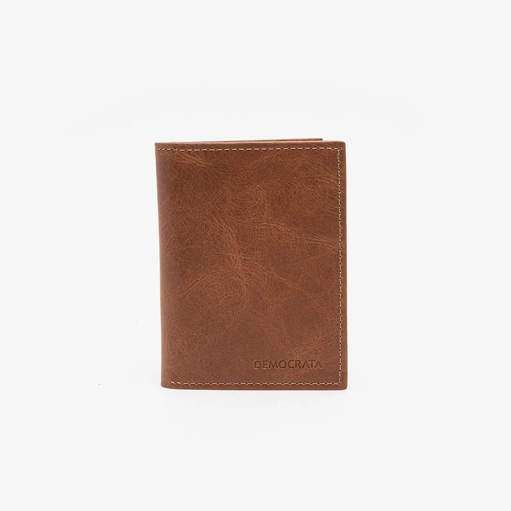 Carteira confeccionada em couro, na cor caramelo. Parte interna com 4 divisórias para cartões, 1 divisória para moedas,1 compartimento interno extra, e 1 abertura total para cédulas.Dimensões: 10,5cm x 8cm